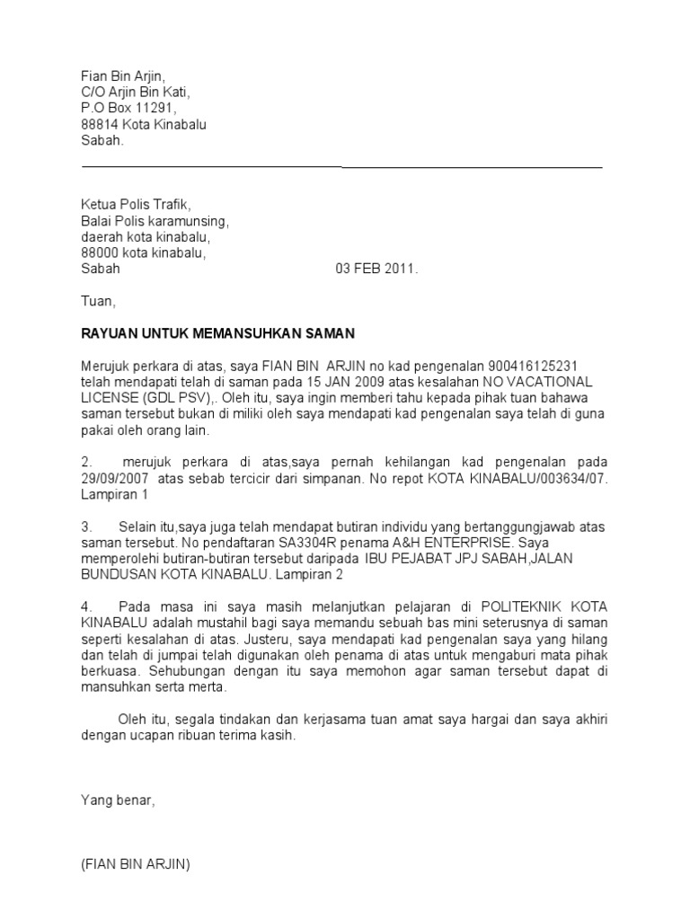 Surat Rayuan Memansuhkan Saman Trafik via www.scribd.com